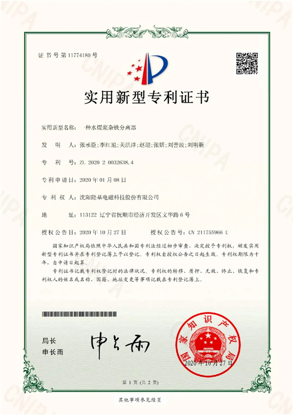 隆基水煤漿除鐵器從產(chǎn)品性能到自動操控,都凝聚了隆基的創(chuàng)新智慧,展現(xiàn)了隆基的品牌領(lǐng)跑實力,產(chǎn)品已獲得國家知識產(chǎn)權(quán)局頒發(fā)的實用新型專利證書。