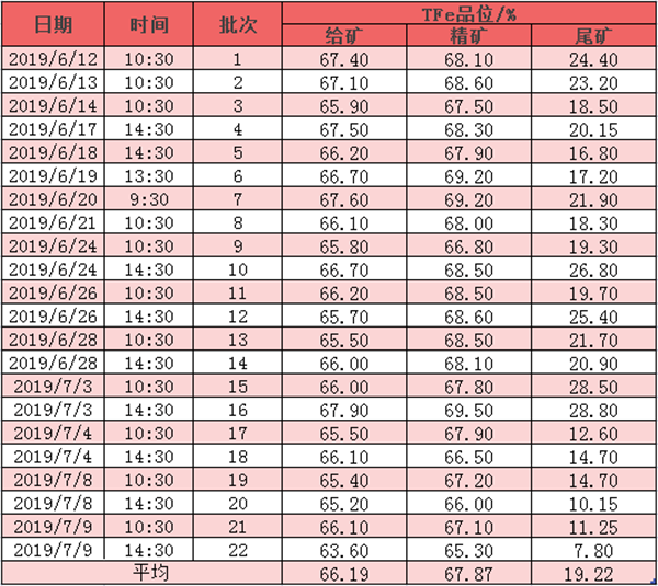 試驗地點為四選作業(yè)區(qū)大選磁選柱間,試驗時間從2019年6月12日至7月9日。由四選作業(yè)區(qū)和生產(chǎn)技術(shù)室共同組織采樣;由生產(chǎn)技術(shù)室試驗室進行制樣、粒度篩析和化驗分析。