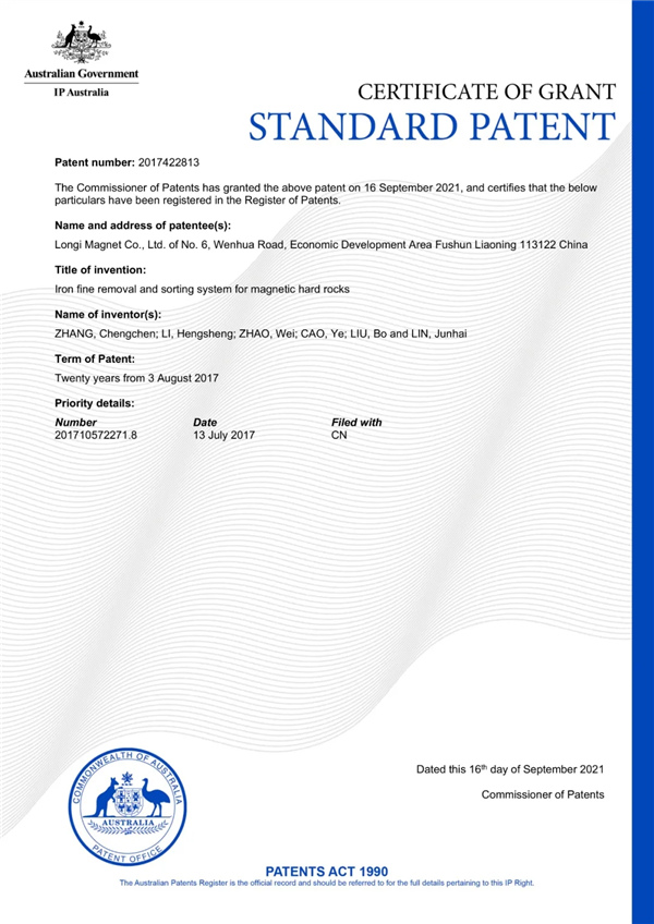 近日,隆基正式收到頑石除鐵系統(tǒng)澳大利亞專利證書(shū),在頑石除鐵全球市場(chǎng)布局方面取得重要突破。